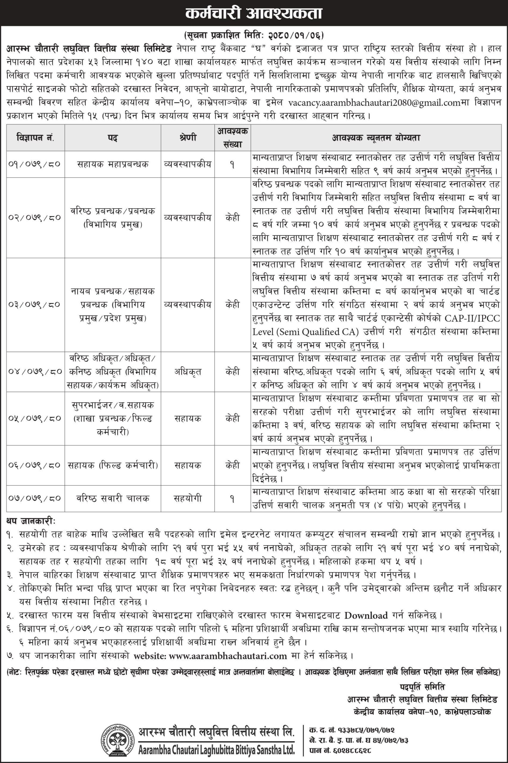 आरम्भ चौतारी लघुवित्तद्वारा कर्मचारी माग, कति चाहिन्छ शैक्षिक योग्यता ?