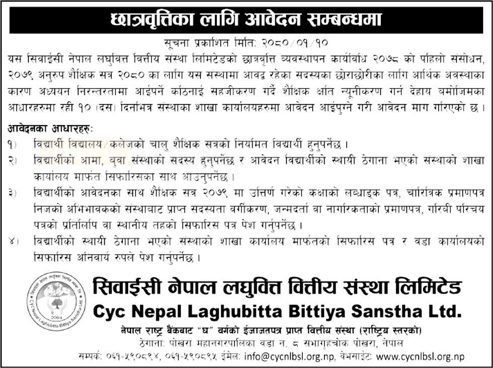 संस्थाले सदस्यका छोराछोरीका लागि आर्थिक अवस्थाका कारण अध्ययन निरन्तरतामा आइपर्ने कठिनाई सहजीकरण गर्दै शैक्षिक क्षति न्यूनीकरण गर्न १० दिनभित्र संस्थाको कार्यालयहरुमा आवेदन दिन अनुरोध गरेको छ ।