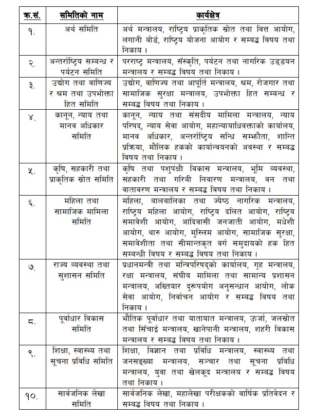 प्रतिनिधि सभा नियमावली २०७९ को दफा १७३ मा १० वटा विषयगत समिति गठन गरी सरकारलाई जनताको प्रतिनिधिहरुको संसदप्रति जवाफदेही र उत्तरदायी बनाइने उल्लेख छ । उक्त नियमावली गत चैत्र १९ गते पारित भइसकेको छ । तर, संसदीय समिति बनाउने पक्षमा न सरकार नै तातेको छ न प्रतिपक्ष नै तातेको छ ।