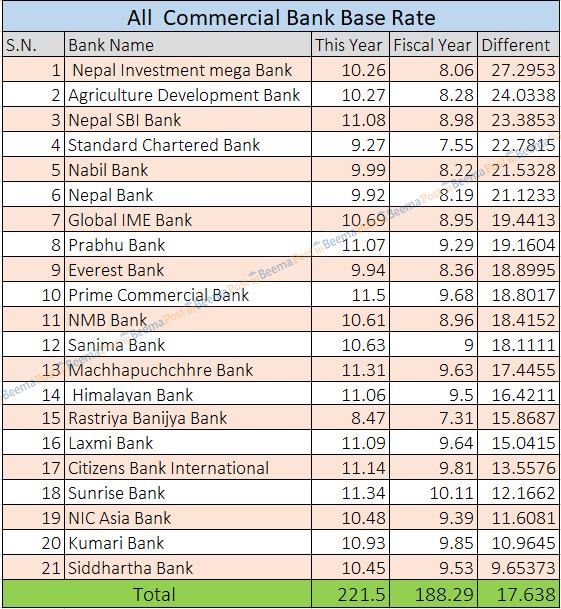 त्यस्तै, स्टाण्डर्ड चार्टट बैंकको ९.२७ प्रतिशत बेसरेट, एनएमबि बैंकको १०.६१, एनआइसी एशिया बैंकको १०.४८, सिद्धार्थ बैंंकको १०.४५, कृषि विकास बैंकको १०.२७, नविल बैंकको ९।९९, एभरेष्ट बैंकको ९.९४ वेसरेट रहेको छ।