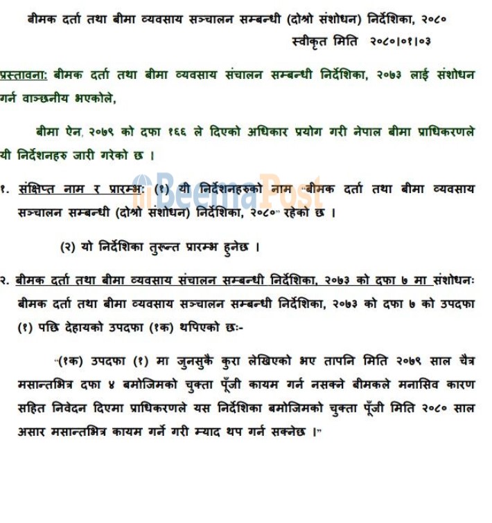 बीमक दर्ता तथा बीमा व्यवसाय सम्बन्धी निर्देशिका २०८० जारी, पुुँजि जुटाउने समय थप गर्न प्राधिकरणमा कारणसहित निवेदन पेश गनुपर्ने