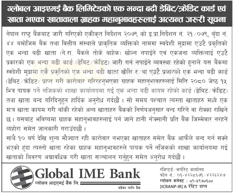 ग्लोबल आइएमई बैंकले आफ्ना खातावालाहरुको लागि निकाल्यो यस्तो सूचना