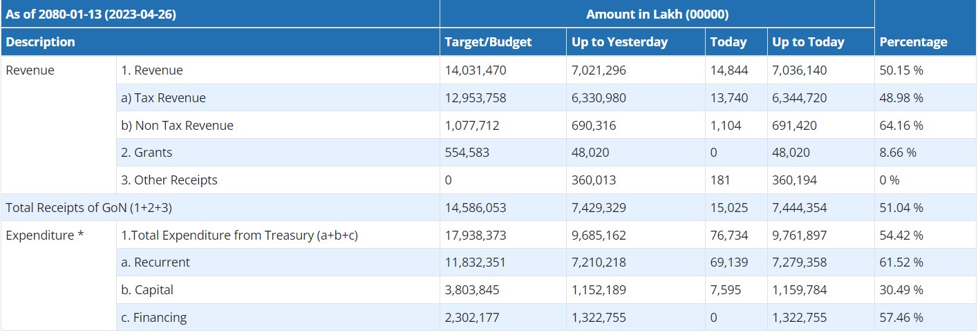 महालेखा नियन्त्रकको कार्यालयका अनुसार बैशाख १३ गतेसम्मको विवरण अनुसार कूल १२ खर्ब ९५ अर्ब राजश्व लक्ष्य रहेकोमा जम्मा ४८.९८ प्रतिशत अर्थात छ खर्व ३४ करोड रुपैयाँ राजश्व उठेको छ । सो अनुसार अझै छ अर्ब ६१ करोड रुपैयाँ राजश्व उठ्न बाँकी छ । जुन अबको ७५ दिनमा कुनै हालतमा सम्भव हुने छैन । अहिलेको प्रक्षेपित राजश्व संकलन दर अनुसार अबको ७५ दिनमा बढीमा १०० अर्ब राजश्व संकलन हुनसक्ने देखिएको छ । तर चालु खर्चकै लागि सरकारलाई अझै ४५६ अर्ब रुपैयाँ आवश्यक छ । राजश्व संकलन र खर्च गर्ने चालु खातामा आएको ठूलो अन्तरले चालु आवमा करिब ३०० अर्बको हाराहार हुने देखिएको छ । सरकारले उक्त रकमको जोहो गर्न नसक्दा अहिलेदेखि नै प्रहरीले तलव पाउन छोडेका छन् । अबको दिनमा अन्य कर्मचारीहरुले तलव पाउन सरकारले थप ३०० अर्ब रुपैयाँ तत्काल जोहो गर्नुपर्ने देखिएको छ । सरकारले उक्त रकम जोहो गर्न अर्थात आन्तरिक ऋण वा बाह्य ऋण लिन सफल भएमा सामाजिक सुुरक्षा भत्ता, बृद्ध भत्ता र कर्मचारीहरुले तलव पाउँछन्, अन्यथा कठिन हुने देखिएको छ ।