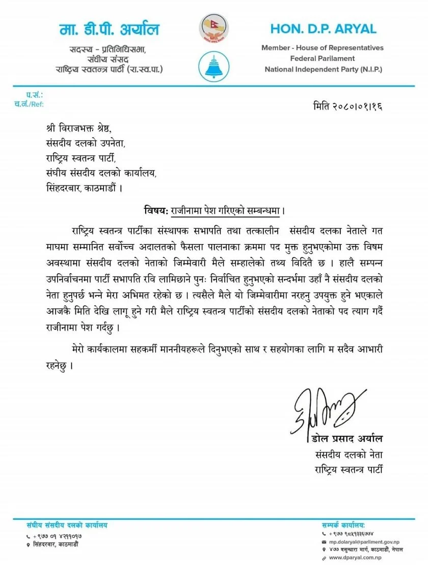 पार्टी अध्यक्ष लामिछानेलाई संसदीय दलको नेताको रुपमा मार्ग प्रशस्त गर्न अर्यालले राजिनामा दिएका हुन् । अब संसदीय दलको नेताका रुपमा आजबाट रवि लामिछाने चयन हुनेछन् ।