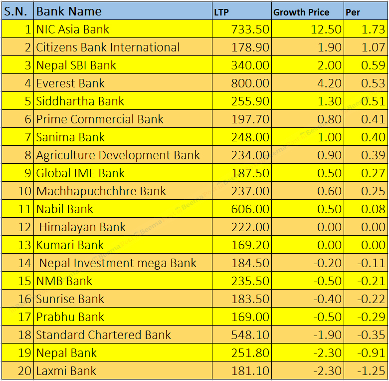 त्यस्तै, नेपाल एसबिआई बैंकको शेयरमूल्य ०.५९ प्रतिशत, एभरेष्ट बैंकको ०.५३ प्रतिशत, सिद्धार्थ बैंकको ०.५१ प्रतिशत, प्राइम कमर्सियल बैंकको ०.४१ प्रतिशत, सानिमा बैंकको ०.४० प्रतिशत, कृषि विकास बैंकको ०.३९ प्रतिशतले शेयर मूल्य बढेको छ ।