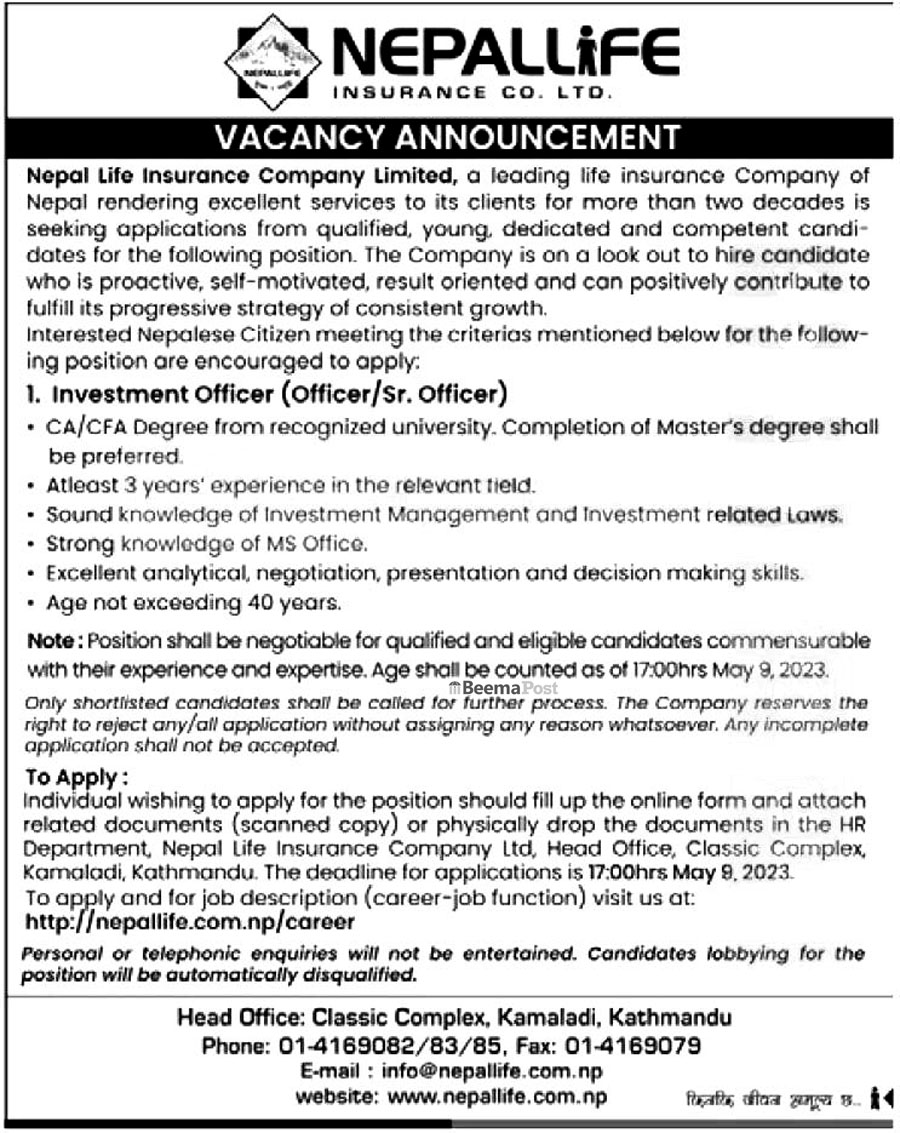 इच्छुक आवेदकले कम्पनीको वेवसाइट https://www.nepallife.com.np/en/career मार्फत आवेदन दिन सक्नेछन् ।