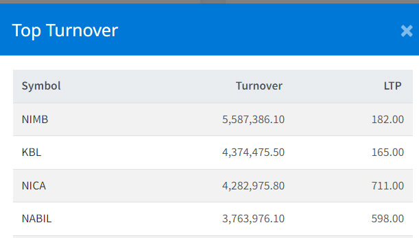 यो समाचार तयार पार्दासम्म नेपाल इन्भेष्टमेन्ट मेगा बैंक, कुमारी बैंक, एनआइसी एशिया बैंक र नबिल बैंकको शेयर सर्वाधिक खरिदबिक्री भएको छ । नेपाल इन्भेष्टमेन्ट मेगा बैंकको ५५ लाख ८७ हजार, कुमारी बैंकको ४३ लाख ७४ हजार, एनआइसी एशिया बैंकको ४२ लाख ८२ हजार र नबिल बैंकको ३७ लाख ६३ हजार रुपैयाँमाथिको कारोबार भएको छ ।