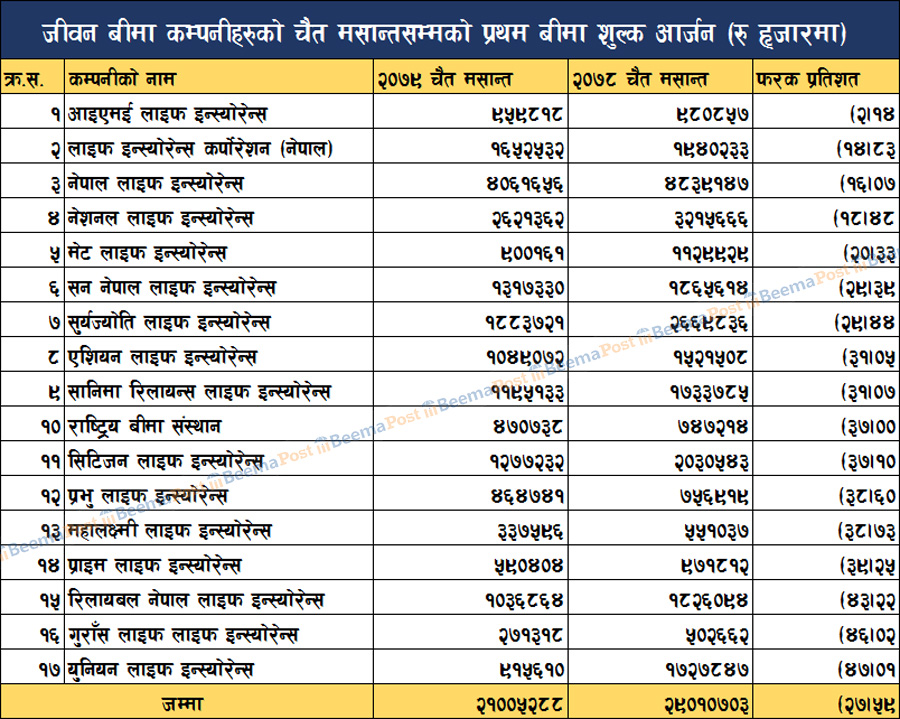 चैत मसान्तसम्म सबैभन्दा बढी प्रथम बीमा शुल्क आर्जन गर्ने कम्पनीमा भने नेपाल लाइफ इन्स्योरेन्स रहेको छ । कम्पनीले सो अवधिसम्म ४ अर्ब ६ करोड १६ लाख रुपैयाँ फर्स्ट प्रिमियम कलेक्सन गरेको छ । त्यस्तै नयाँ ब्यवसायमार्फत दोस्रो धेरै प्रिमियम कलेक्सन गर्ने कम्पनीमा नेशनल लाइफ रहेको छ । नेशनलले पनि सो अवधिसम्म २ अर्ब ६२ करोड रुपैयाँ प्रथम बीमा शुल्क आर्जन गरेको छ ।