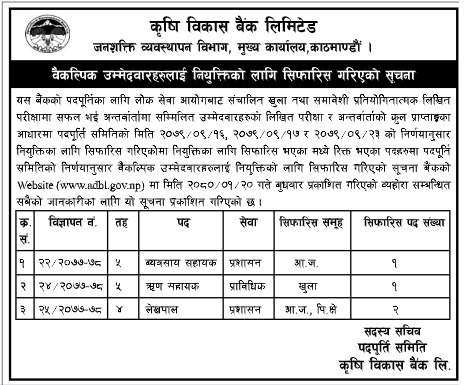 काठमाडौं । कृषि विकास बैंक लिमिटेडले बैंकल्पिक उम्मेदवारहरुलाई नियुक्तिको लागि सिफारिस गरेको छ ।