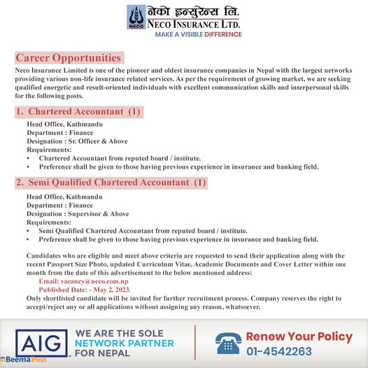काठमाडौं । नेको इन्स्योरेन्स लिमिटेडले रोजगारको अवसर खुलाएको छ । इन्स्योरेन्सले एक सूचना प्रकाशित गर्दै चार्टेट एकाउन्टेन्ट र सेमि क्वालिफाइड चार्टेट एकाउन्टेन्ट पदमा कर्मचारी माग गरेको हो ।
