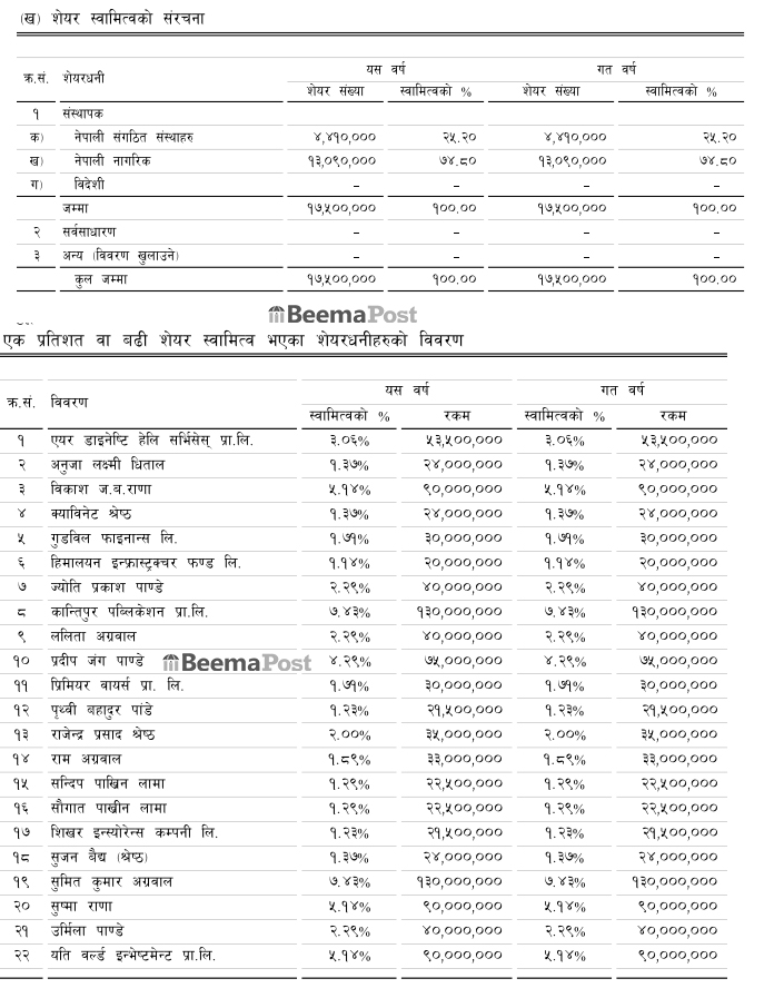 त्यस्तै, कम्पनीमा गुडविल फाइनान्स लिमिटेडको १.७१ प्रतिशतले ३ करोड, हिमालयन इन्फ्रास्ट्रक्चर फण्ड लिमिटेडको १.१४ प्रतिशतले २ करोड, कान्तिपुर पब्लिकेशन प्रालिको ७.४३ प्रतिशतले १३ करोड, ललिता अग्रवालको २.२९ प्रतिशतले ४ करोड, ज्योति प्रकाश पाण्डेको २.२९ प्रतिशतले ४ करोड, ११ प्रिमियर वायर्स प्रालिको १.७१ प्रतिश्शतले ३ करोड, पृथ्वी बहादुर पांडेको १.२३ प्रतिशतले २ करोड १५ लाख, राजेन्द्र प्रसाद श्रेष्ठको २ प्रतिशतले ३ करोड ५० ५० लाख, राम अग्रवालको १.८९ प्रतिशतले ३ करोड ३० लाख, सन्दिप पाखिन लामाको १.२९ प्रतिशतले २ करोड ५० लाख, सौगात पाखीन लामाको १.२९ प्रतिशतले २ करोड ५० लाख रुपैयाँ बराबरको शेयर स्वामित्व रहेको छ ।