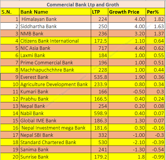 यसका साथै, लक्ष्मी बैंकको ०.५५ प्रतिशतले बढेर १८४ रुपैयाँ, प्राइम कमर्सियल बैंकको ०.५१ प्रतिशतले बढेर १९६ रुपैयाँ, १९६ रुपैयाँ, माछापुच्छ«े बैंकको ०.४४ प्रतिशतले बढेर २२८ रुपैयाँ, कृषि विकास बैंकको ०.३४ प्रतिशतले बढेर २३३.९ रुपैयाँ, कुमारी बैंकको ०.३० प्रतिशतले बढेर १६६, प्रभु बैंकको ०.२४ प्रतिशतले बढेर १६६.५ रुपैयाँ, नेपाल बैंकको २५४ रुपैयाँ, नविल बैंकको ०.७ प्रतिशतले बढेर ५९८.९ रुपैयाँ र ग्लोबल आइएमई बैंकको ०.७ प्रतिशतले बढेर १८६.३ रुपैयाँमा अन्तिम कारोबार भएको छ ।