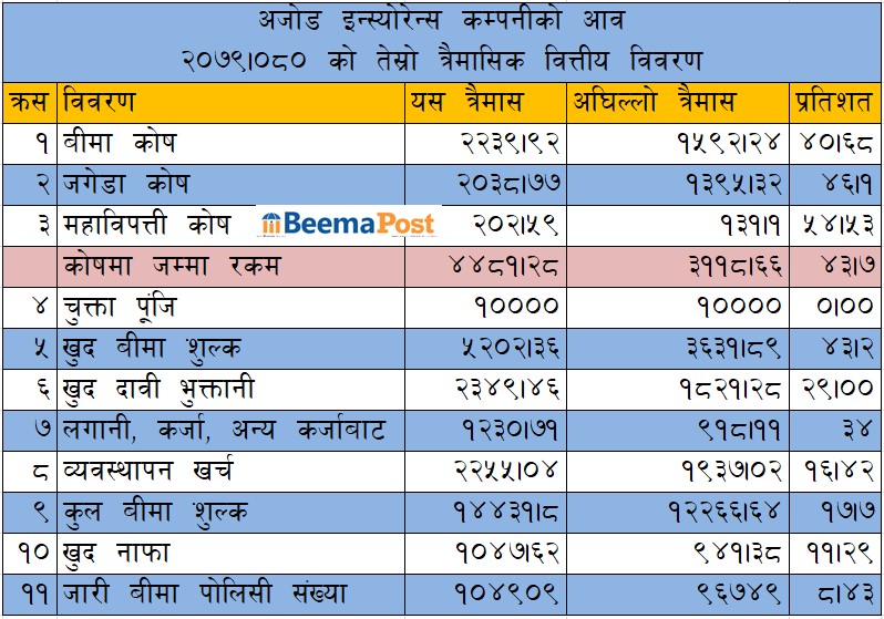गत आर्थिक बर्षको तुलनामा बीमा कोष, जगेडा कोष र महाविपत्ति कोष गरि कम्पनीको जम्मा कोष ४३ प्रतिशतले बढेको तथ्यांकले देखाएको छ।कम्पनीले तेस्रो त्रैमासको अवधिसम्मा १ लाख ४ हजार ९०९ वटा बीमापोलिसी जारी गर्न सफल भएको छ।