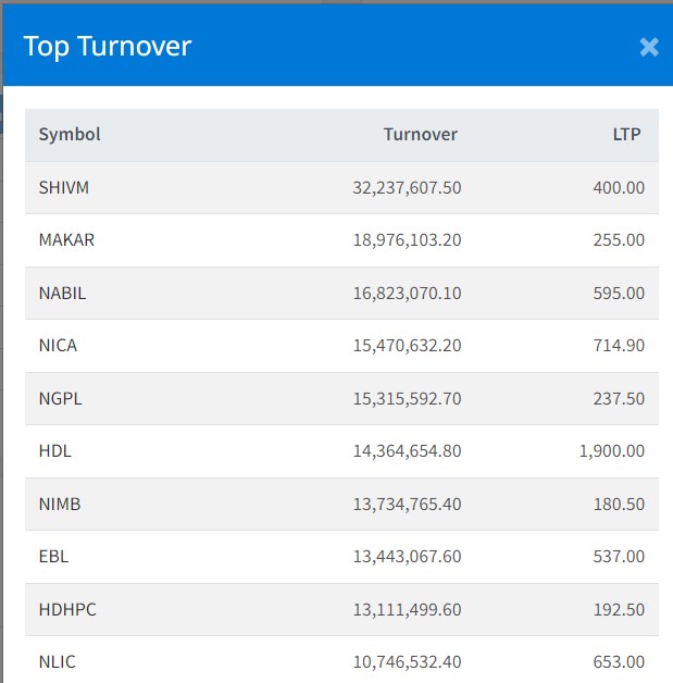 त्यस्तै, मकर जितुमाया हाइड्रोपावरको १ करोड ८९ लाख, नबिल बैंकको १ करोड ६८ लाख, एनआइसी एशिया बैंकको १ करोड ५३ लाख र ङादी ग्रुप पावरको १ करोड ५३ लाख रुपैयाँमाथिको कारोबार भएको छ ।