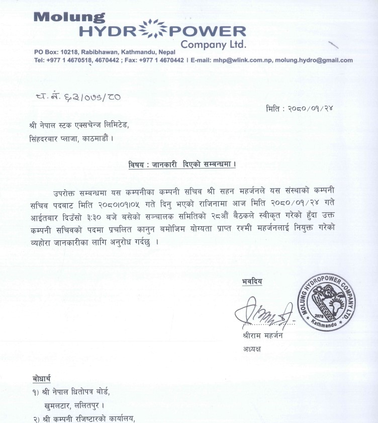 हाइड्रोपावरका कम्पनी सचिवको जिम्मेवारीमा रहेका सहन महर्जनले बैशाख ५ गते राजिनामा दिएको हुदाँ बैशाख २४ गते बसेको संचालक समितिको बैठकले उनको राजिनामा स्वीकृत गरी महर्जनलाई नियुक्त गरेको हो ।