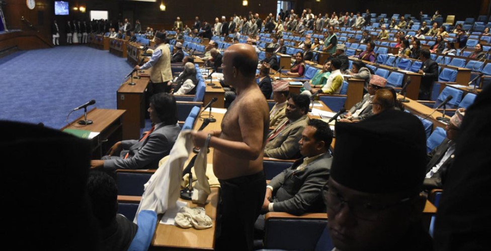 नेपालको संसदीय अभ्यासको इतिहासमा पहिलो पटक संसद भवनभित्र सांसदले अर्धनग्न भएर विरोध जनाएका हुन् । सासद अमरेश कुमार सिंहले देशमा बढ्दो भ्रष्टाचार सेटिङका विरुद्धमा बोल्न खोजेका थिए । सभामुख घिमिरेले समय नदिएपछि उनले भटाभट कपडा खोलेर अर्धनग्न बनेका थिए ।