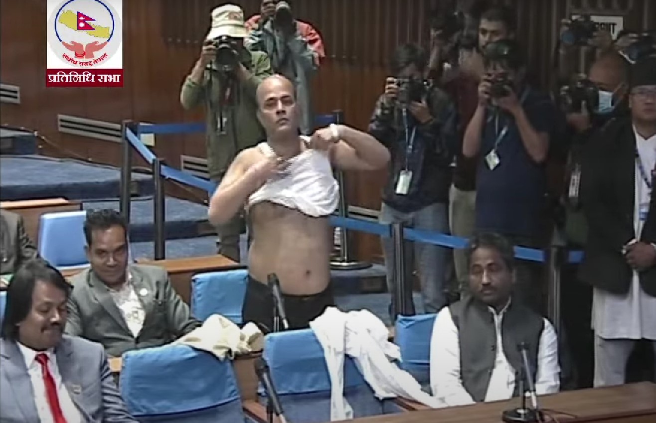 काठमाडौं । नेपालको संसदीय इतिहासमा बिरलै देखिने घट्ना आजको संसदमा देखिएको छ । आज बसेको प्रतिनिधि सभाको बैठकमा सांसद अमरेश कुमार सिंहले भ्रष्टाचारविरुद्धमा बोेल्न सभामुख देवराज घिमिरेले समय नदिएपछि सांसद अमरेश कुमार सिंहले भटाभट सर्ट र गन्जी खोजेर संसद भवन भित्रै विरोध गरेका हुन् ।
