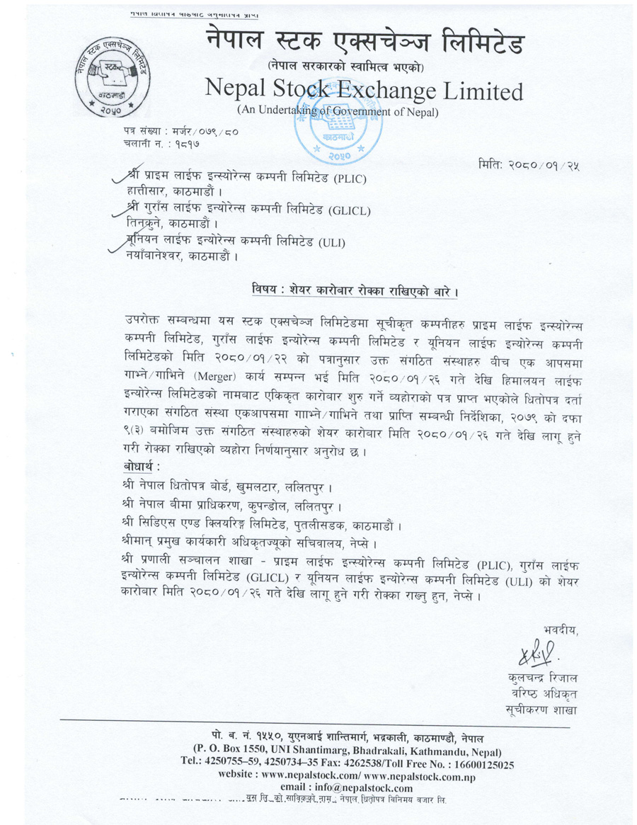 तीन जीवन बीमा कम्पनीको वैशाख २२ गतेको पत्रानुसार उक्त संगठित संस्थाहरुबीच एकआपसमा गाभ्ने।गाभिने वा मर्जर कार्य सम्पन्न भई वैशाख २६ गतेदेखि ‘हिमालयन लाइफ इन्स्योरेन्स’ लिमिटेडको नामबाट एकीकृत कारोबार सुरु गर्ने भएसँगै नेप्सेले उक्त कम्पनीहरुको शेयर कारोबार रोक्का राख्ने भएको हो ।