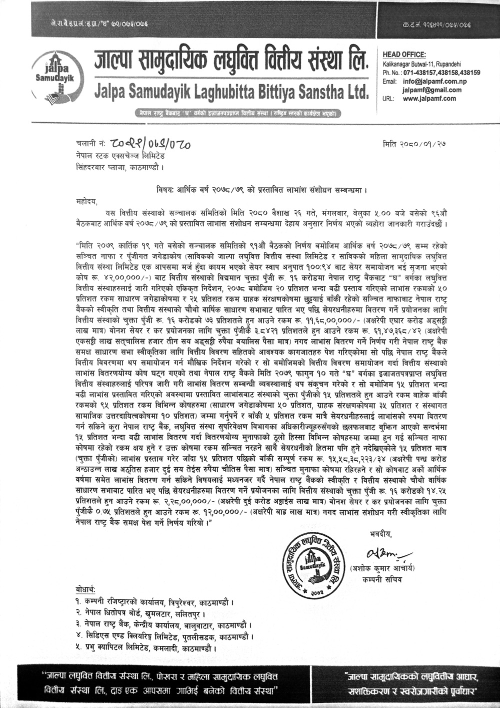 नेपाल राष्ट्र बैंकद्वारा जाल्पा सामुदायिक लघुवित्तको बम्पर लाभांश संशोधन, कति बाँड्दैछ अब ?