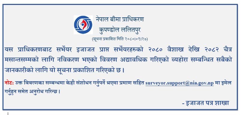 काठमाडौं । नेपाल बीमा प्राधिकरणले इजाजत प्राप्त सर्भेयरहरुको विवरण संशोधन गनुपर्ने भएमा प्रमाणसहित इमेल पठाउन आग्रह गरेको छ ।प्राधिकरणले आज एक सूचना प्रकाशित गर्दै इजाजत प्राप्त सर्भेयरहरुको २०८० बैशाख २०८२ चैत्र मसान्तसम्मको लागि विवरण अद्यावधिक गरेको जानकारी गरेको हो ।