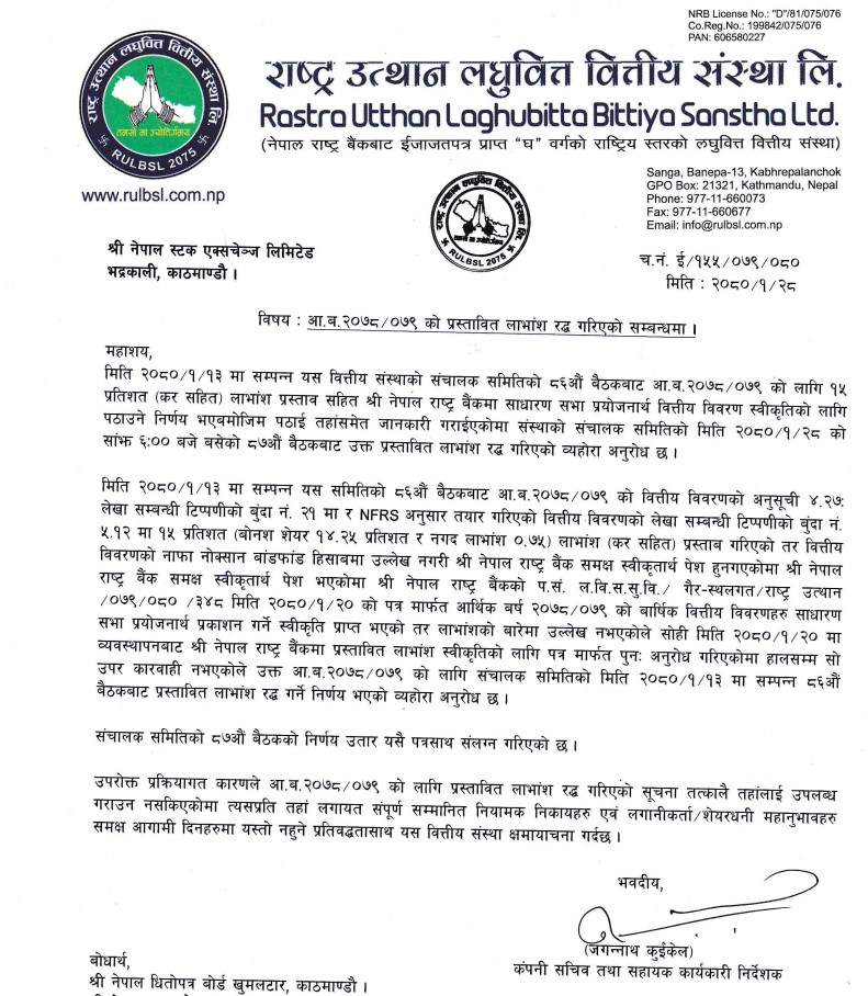 राष्ट्र उत्थान लघुवित्तको लाभांश रद्द, यस्तो छ कारण