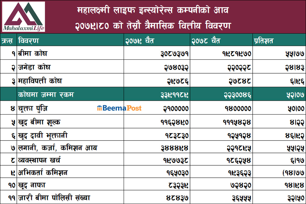महालक्ष्मी लाइफ इन्स्योरेन्सको बीमा कोषको आकार ५५ प्रतिशतले बढ्यो, १ अर्ब ११ करोडमाथिको व्यवसाय