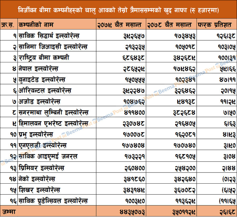 निर्जीवन बीमा कम्पनीहरुको खुद नाफा २६ प्रतिशतले बढ्यो, साविक सिद्धार्थ र सानिमा जिआइसीको प्रगति हुँदा तीन कम्पनीको मुनाफा घट्यो