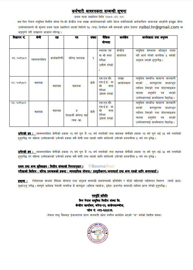 संस्थाले वरिष्ठ प्रबन्धक पदमा १ जना, सहायक र कनिष्ठ सहायक पदमा केहि संख्याँले कर्मचारी माग गरको छ । सो पदहरुमा आवेदन दिनको लागि एसएलसी देखि स्नात्तक उत उत्तिर्ण गरेको हुनुपर्ने संस्थाले जनाएको छ ।