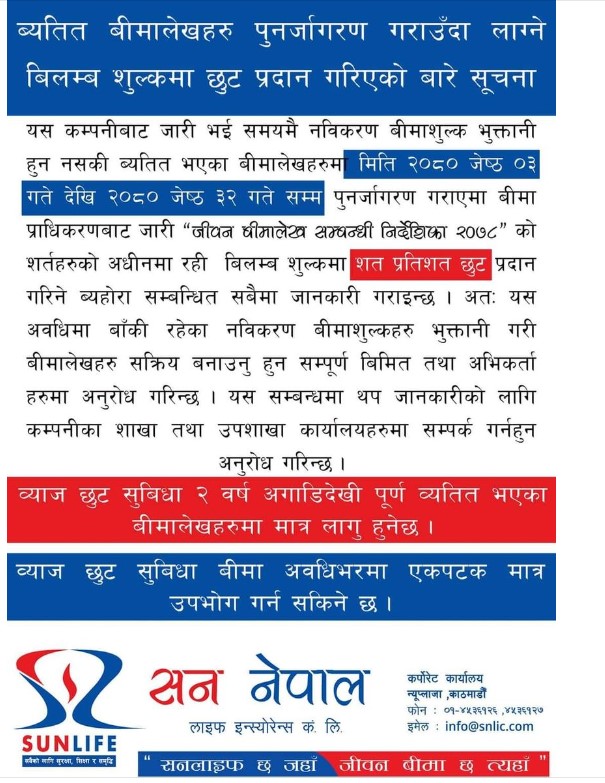 सन नेपाल लाइफले व्यतित बीमालेखको नविकरण शुल्कमा शतप्रतिशत छुट दिने, कहिलेसम्म पाइन्छ ?