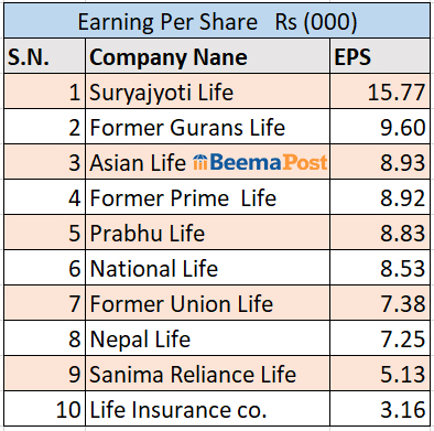 त्यस्तै, त्रमशः साविकको प्राइम लाइफको ८.९२ रुपैयाँ, प्रभु लाइफको ८.८३ रुपैयाँ, नेशनल लाइफको ८.५३ रुपैयाँ, साविकको युनियन लाइफको ७.३८ रुपैयाँ, अधिकांश शुचांकमा अव्वल रहेको नेपाल लाइफको ७.२५ रुपैयाँ र सानिमा रिलायन्स लाइफको ५.१३ रुपैयाँ प्रतिशेयर आम्दानी रहेको छ ।