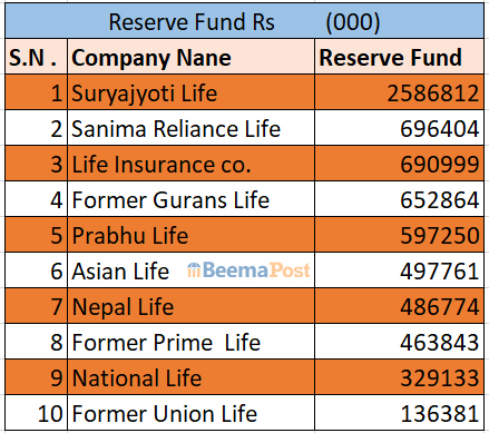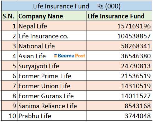 यस अवधिसम्ममा एशियन लाइफको ३६ अर्व ५४ करोड रुपैयाँ, सुर्यज्योति लाइफको २४ अर्व ७३ करोड, साविकको प्राइम लाइफको २१ अर्व ५३ करोड, साबिकको युनियन लाइफको १४ अर्व ३१ करोड रुपैयाँ, साबिकको गुराँस लाइफको १४ अर्व १ करोड र सानिमा रिलायन्स लाइफको ८ अर्व ५४ करोड रुपैयाँ बराबरको जीवन बीमा कोषको सञ्चिति रहेको छ ।