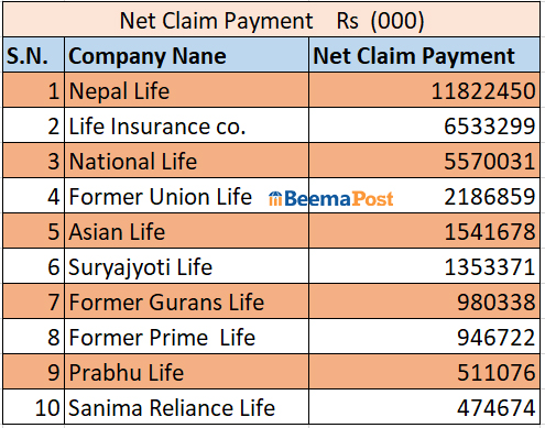 समिक्षा अवधिसम्ममा साविकको युनियन लाइफले २ अर्व १८ करोड रुपैयाँ, एशियन लाइफले १ अर्व ५४ करोड रुपैयाँ, सुुर्यज्योति लाइफले १ अर्व ३५ करोड रुपैयाँ, साबिकको गुराँस लाइफले ९८ करोड करोड रुपैयाँ, साविकको प्राइम लाइफले ९४ करोड रुपैयाँ र मर्जर प्रक्रियामा रहेको प्रभु लाइफले ५१ करोड रुपैयाँ बराबरको खुद दावी भुक्तानी गरेका छन् ।