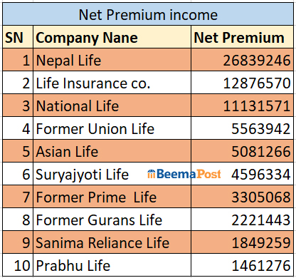 यस अवधिसम्ममा प्राइम लाइफले २१ करोड रुपैयाँ, एशियन लाइफले १९ करोड ४७ लाख रुपैयाँ, गुराँस लाइफले १६ करोड १२ लाख रुपैयाँ, सानिमा रिलायन्स लाइफको १६ करोड १० लाख रुपैयाँ, प्रभु लाइफको १३ करोड २३ लाख रुपैयाँ र साबिकको युनियन लाइफले १२ करोड ९५ लाख रुपैयाँ खुद बीमा शुल्क आर्जन गरेका छन् ।