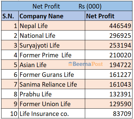 समिक्षा अवधिसम्ममा लाइफ इन्स्योरेन्स कर्पोरेशनले सबैभन्दा कम ८ करोड ३७ लाख रुपैयाँ खुद नाफा आर्जन गर्न सफल भएको छ ।