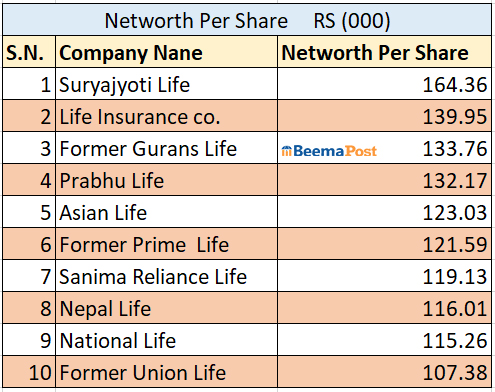 यस अवधिसम्ममा प्रभु लाइफको १३२.१७ रुपैयाँ, एशियन लाइफको १२३.३ रुपैयाँ, साविकको प्राइम लाइफको १२१.५९ रुपैयाँ, सानिमा रिलायन्स लाइफको ११९.१३ रुपैयाँ, नेपाल लाइफको ११६.०१ रुपैयाँ, नेशनल लाइफको ११५.२६ रुपैयाँ प्रतिशेयर नेटवर्थ रहेको छ ।