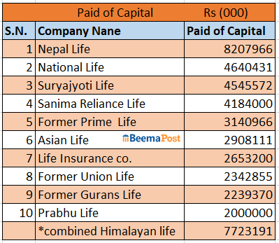 त्यस्तै, सानिमा रिलायन्स लाइफको ४ अर्व १८ करोड ४० लाख रुपैयाँ, साविकको प्राइम लाइफको ३ अर्व १४ करोड ९ लाख रुपैयाँ, एशियन लाइफको २ अर्ब ९० करोड ८१ लाख रुपैयाँ, लाइफ इन्स्योरेन्स कर्पोेरेशनको २ अर्व ६५ करोड ३२ लाख रुपैयाँ, साबिकको युनियन लाइफको २ अर्व ३४ करोड २८ लाख रुपैयाँ र साविकको गुराँस लाइफको २ अर्व २३ करोड ९३ लाख रुपैयाँ चुक्ताँपुँजि रहेको छ ।