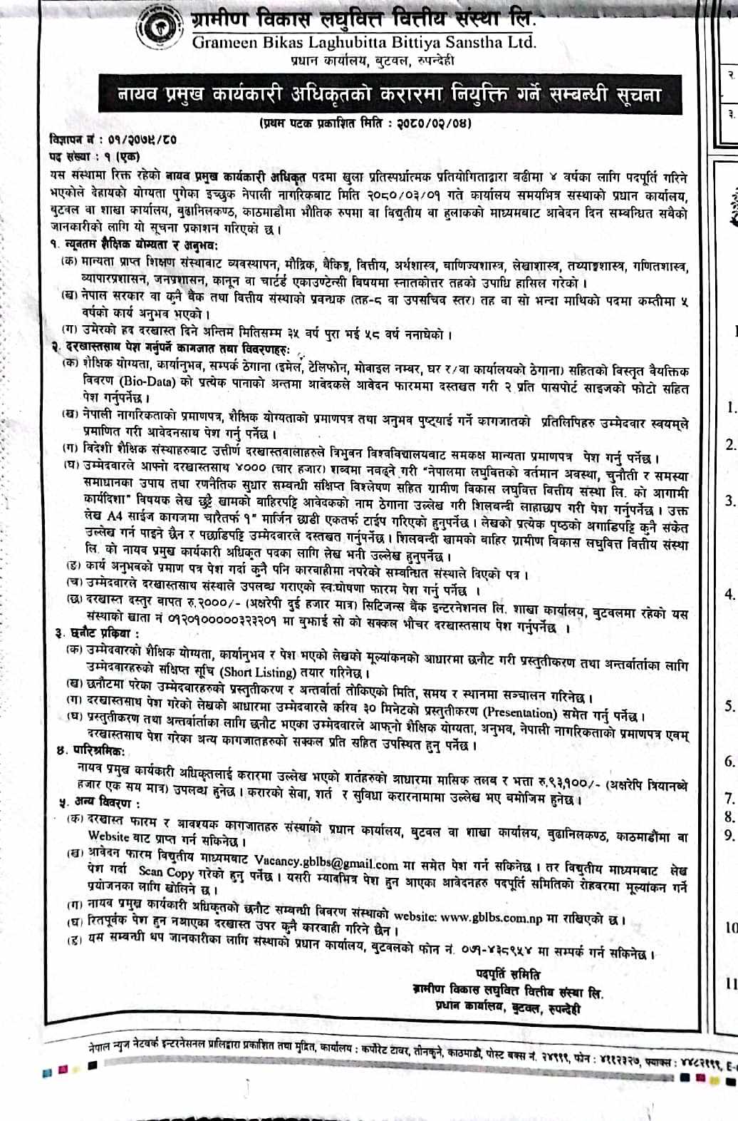 काठमाडौं । ग्रामिण विकास लघुवित्त वित्तीय संस्था लिमिटेडले कर्मचारी माग गरेको छ । संस्थाले आज एक सूचना प्रकाशित गर्दै करार सेवामा नायव प्रमुख कार्यकारी अधिकृत पदमा कर्मचारी माग गरेको हो ।