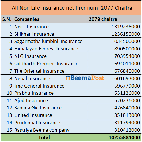 साथै, यस अवधिसम्ममा आइएमई जनरल इन्स्योरेन्सले ५९ करोड रुपैयाँ, मर्जर प्रक्रियामा रहेको प्रभु इन्स्योरेन्सले ५३ करोड रुपैयाँ, अजोड इन्स्योरेन्सले ५२ करोड रुपैयाँ, सानिमा जिआइसी इन्स्योरेन्सले ४७ करोड रुपैयाँ, युनाईटेड इन्स्योरेन्सले ३५ करोड रुपैयाँ, प्रुडेन्सियल इन्स्योरेन्सले ३१ करोड रुपैयाँ खुद बीमा शुल्क आर्जन गरेका छन् ।