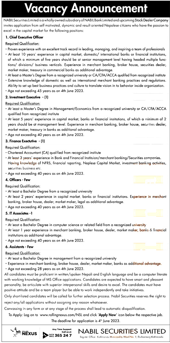 नबिल बैंकद्वारा संचालित नबिल सेक्युरिटिजमा रोजगारको अवसर, यसरी दिनुस् आवेदन