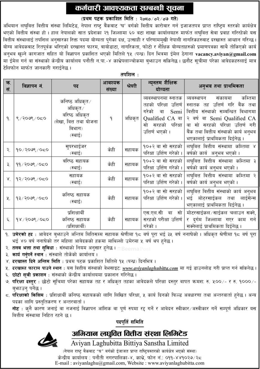 इच्छुक उम्मेदवारले संस्थाको वेवसाईट https://www.aviyanlaghubitta.com/career/ मार्फत आवेदन दिन सक्ने संस्थाले जनाएको छ ।