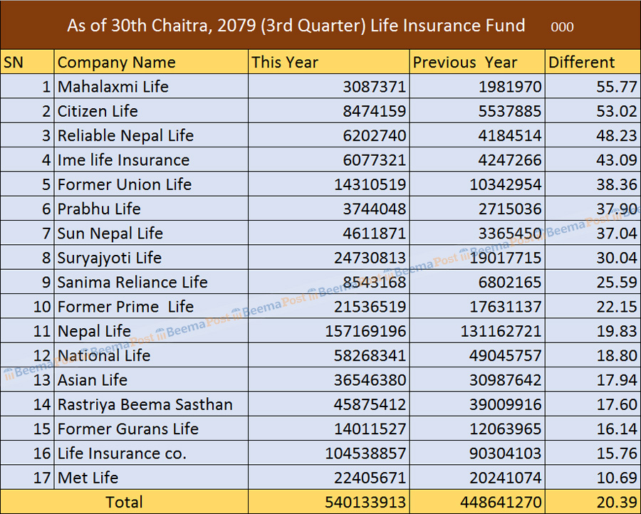 साथै साविक युनियन लाइफको ४३.०९ प्रतिशत, प्रभु लाइफको ३७.९० प्रतिशत, सन नेपालको ३७.०४ प्रतिशत, सुर्यज्योति लाइफको ३०.०४ प्रतिशत, सानिमा रिलायन्सको २५.५९ प्रतिशत, साविक प्राइम लाइफको २२.१५ प्रतिशत, नेपाल लाइफको १९.८३ प्रतिशत, नेशनल लाइफको १८.८० प्रतिशत, एशियन लाइफको १७.९४ प्रतिशत, राष्ट्रिय बीमा संस्थानको १७.६० प्रतिशत, साविक गुराँस लाइफको १६.१४ प्रतिशत, एलआइसी नेपालको १५.७६ प्रतिशत र मेट लाइफको १०.६९ प्रतिशतले बढेको छ ।