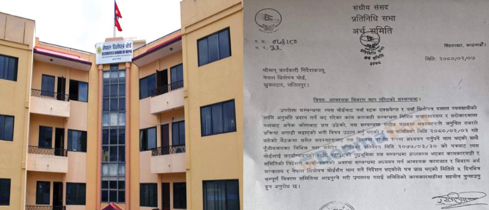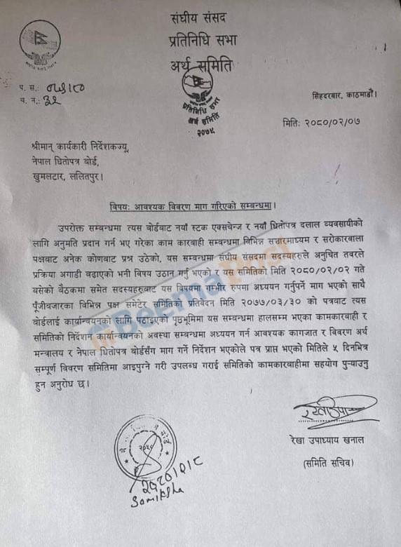 अर्थसमितिको जेठ २ गते बसेको बैठकमा समेत सदस्यहरुबाट यस विषयमा गम्भीर रुपमा अध्ययन गर्नुपर्ने माग भएको साथै पूँजीबजारका विभिन्न पक्ष समेटेर समितिको प्रतिवेदनको पत्रवाट त्यस बोर्डलाई कार्यान्वयनको लागि पठाइएको पृष्ठभूमिमा यस सम्बन्धमा हालसम्म भएका कामकारबाही र समितिको निर्देशन कार्यान्वयनको अवस्था सम्बन्धमा अध्ययन गर्न आवश्यक कागजात र विवरण अर्थ मन्त्रालय र नेपाल धितोपत्र बोर्डसँग माग गर्ने निर्देशन भएकोले पत्र प्राप्त भएको मितिले ५ दिनभित्र सम्पूर्ण विवरण समितिमा आइपुग्ने गरी उपलब्ध गराई समितिको कामकारवाहीमा सहयोग पुयाउन अर्थसमितिले बोर्डलाई पठाएकाे लिखित पत्रमा उल्लेख छ ।