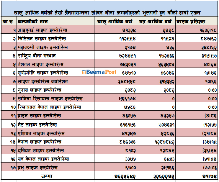 चालु आर्थिक वर्षको नौ महिनामा सरकारी स्वामित्व रहेको राष्ट्रिय बीमा संस्थानको ३१९ प्रतिशत, नेशनल लाइफको ४० प्रतिशत, सूर्यज्योति लाइफको १५ प्रतिशत र लाइफ इन्स्योरेन्स कर्पोरेशनको १० प्रतिशतले भुक्तानी गनुपर्ने दाबी रकम बाकि रहेको छ ।