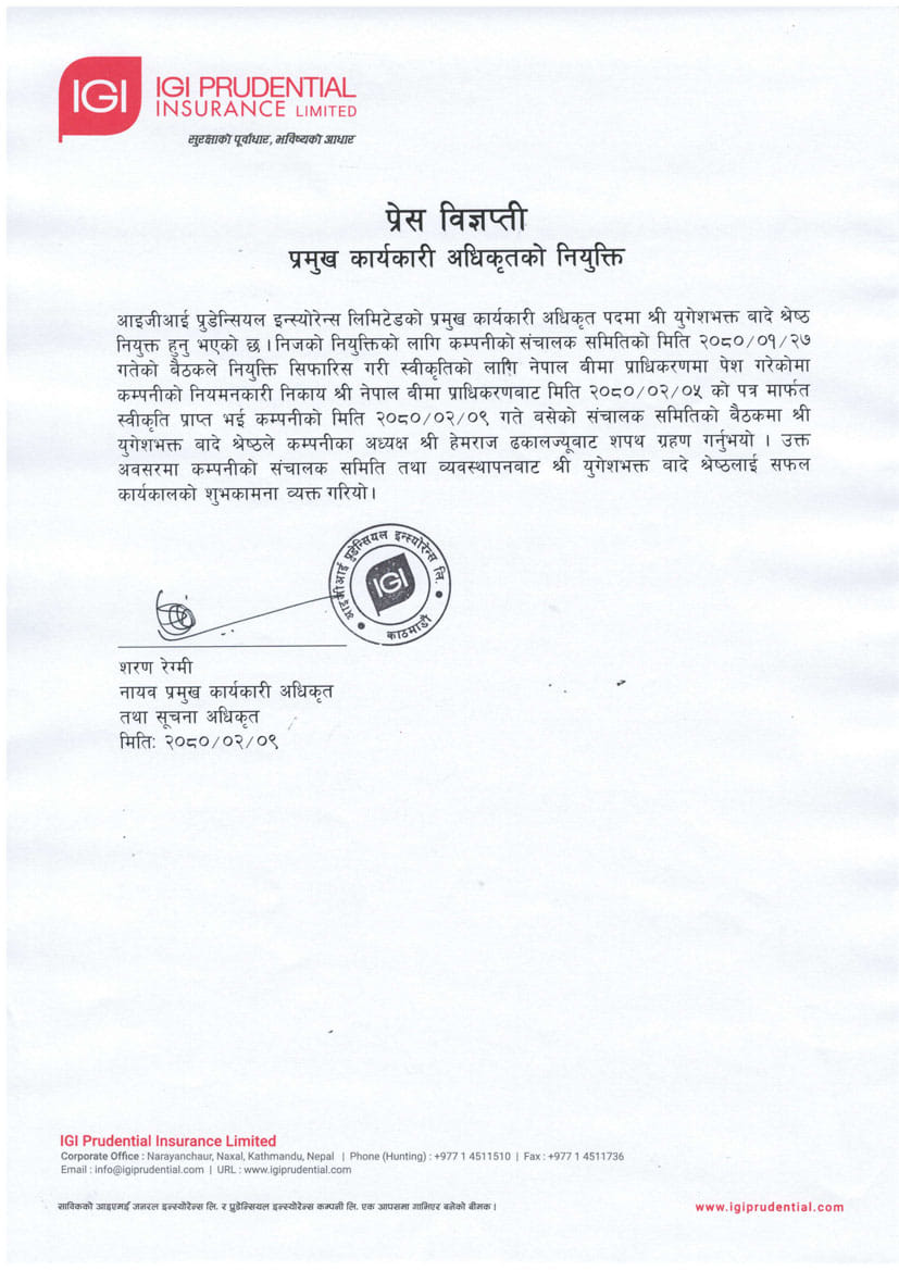 कम्पनीको नियमनकारी निकाय नेपाल बीमा प्राधिकरणबाट जेठ ५ को पत्र मार्फत स्वीकृति प्राप्त भई आए बमोजिम कम्पनीको आजै बसेको सञ्चालक समितिको बैठकले युगेशभक्त बादे श्रेष्ठलाई सिईओ नियुक्त गरेको थियो ।