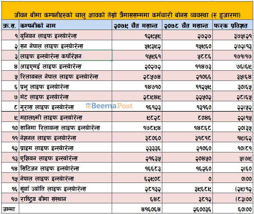 गत आर्थिक वर्षको सोहि अवधिसम्ममा जीवन बीमा कम्पनीहरुले २६ करोड रुपैयाँ कर्मचारी बोनस ब्यबस्था गरेका थिए ।