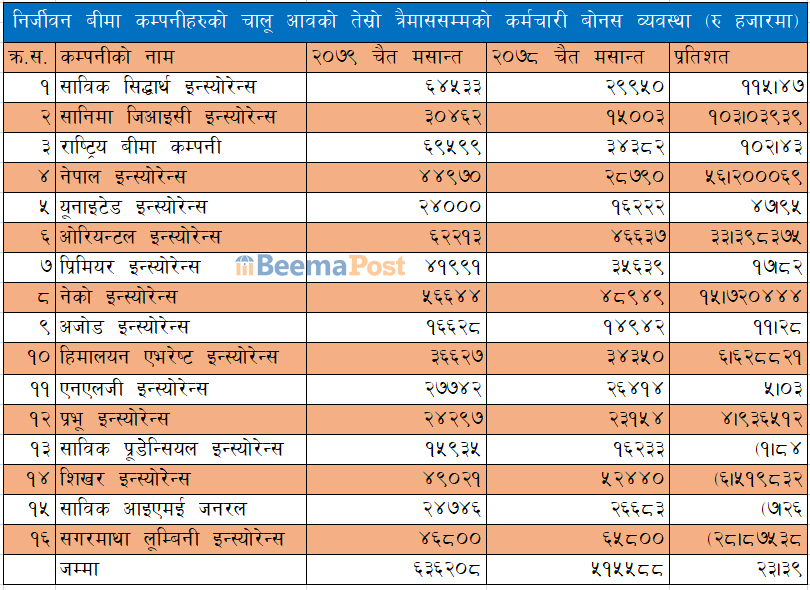 १६ निर्जीजन बीमा कम्पनीहरुले प्रकाशित गरको वित्तीय विवरण अनुसार कर्मचारी बोनस व्यवस्था गत आर्थिक वर्षको तुलनामा २३ दशमलव ३९ प्रतिशतले बृद्धि भएको तथ्याङ्कले देखाएको छ ।