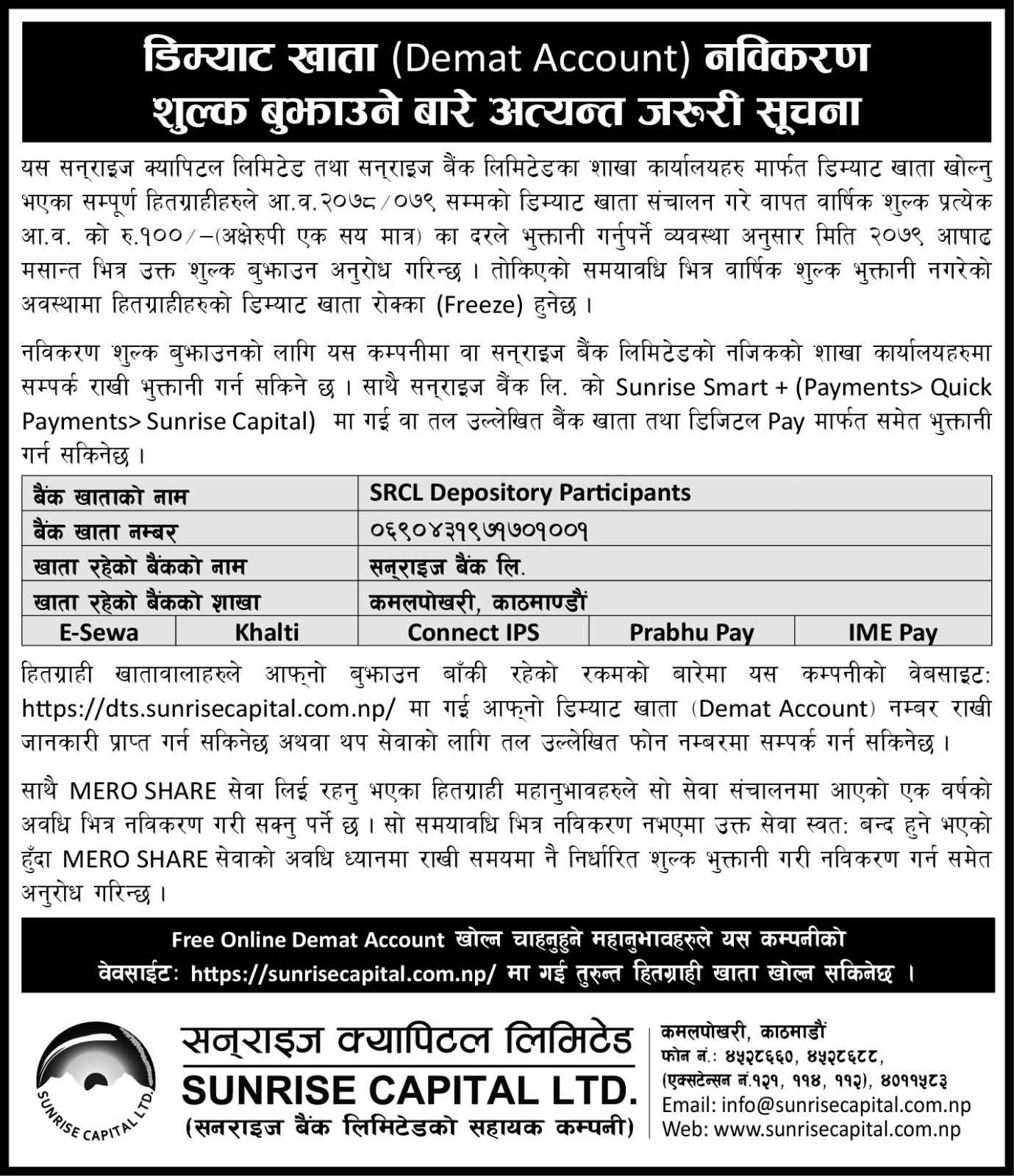 सनराइज क्यापिटल मार्फत हितग्राही खाता खोलि धितोपत्रको कारोबार गरिरहेका खातावालामध्ये नविकरण गर्न बाकि रहेका हितग्राही खातावालालाई चालु आर्थिक वर्षको असार मसान्तभित्र नविकरण शुल्क बुझाउन अनुरोध गरेको छ ।