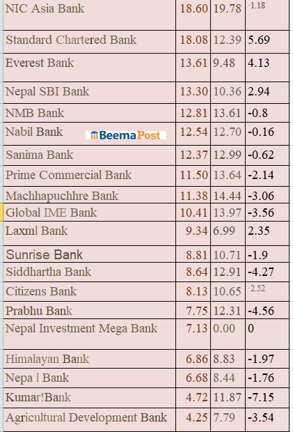 चार्टर्ड, एभरेष्ट, नेपाल एसबीआई र ग्लोबल आइएमई बैंकको मात्र आरओई बढेको छ। बाँकी सबै बैंकको आरओईमा गिरावट देखिएको छ। सबैभन्दा कम कृषि विकास बैंकको ४.२५ प्रतिशत मात्र रहेको छ। समग्रमा हेर्दा विगत वर्षहरुमा उल्लेख्य मात्रामा चुक्ता पुँजी वृद्धि नगरेका वाणिज्य बैंकहरु इक्विटीमा प्रतिफलको सूचीमा अरुभन्दा अगाडि देखिएका छन्।