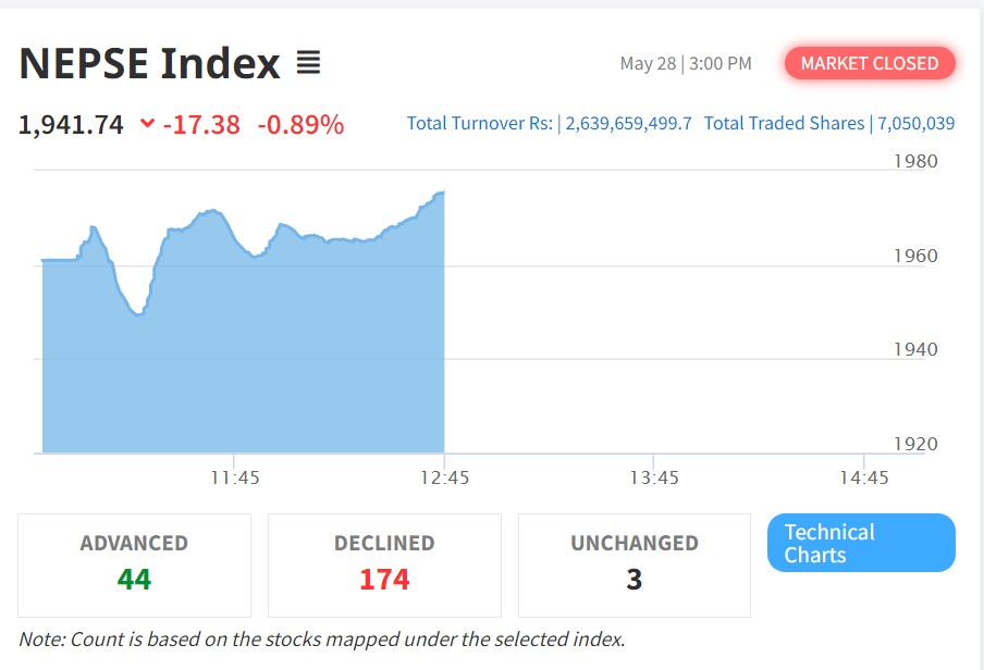 १७ अंकले घट्यो नेप्से, ११ उपसूचक राताम्य हुँँदा कारोबार साढे दुई अर्ब