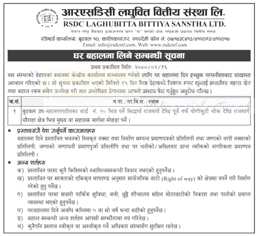 संस्थाले बुटवल उप महानगरपालिका वडा नं. १० भित्र पर्ने सिद्धार्थ राजमार्ग देखि पूर्व तर्फ योगीकुटी चोकदेखि राजमार्ग चौराहा क्षेत्रभित्र मुख्य वा सहायक मार्गमा मोहडा पर्ने गरी कार्यालय खोजको छ ।